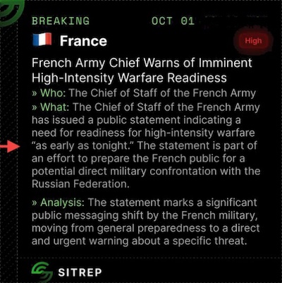 Franska arméns chef har offentligt uppmanat Frankrikes befolkning att ”vara redo för högintensiv [militär] konflikt redan ikväll”. Ryssland–Polen? Ledarna skulle inte låta honom säga detta offentligt om inte hotet vore verkligt.